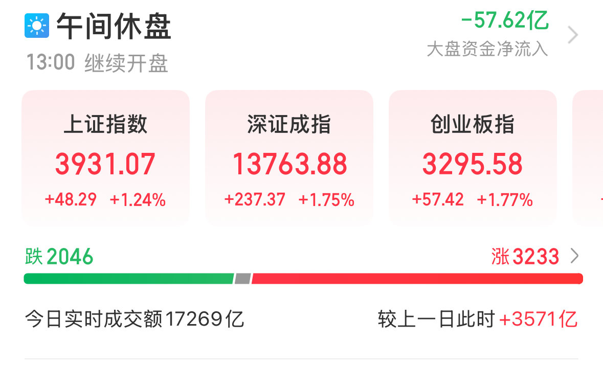 同时,深成指高开0.53%,午盘收报13763.88点;创业板指高开0.40%,午盘收报3295.58点;科创50午盘收报1578.88点。