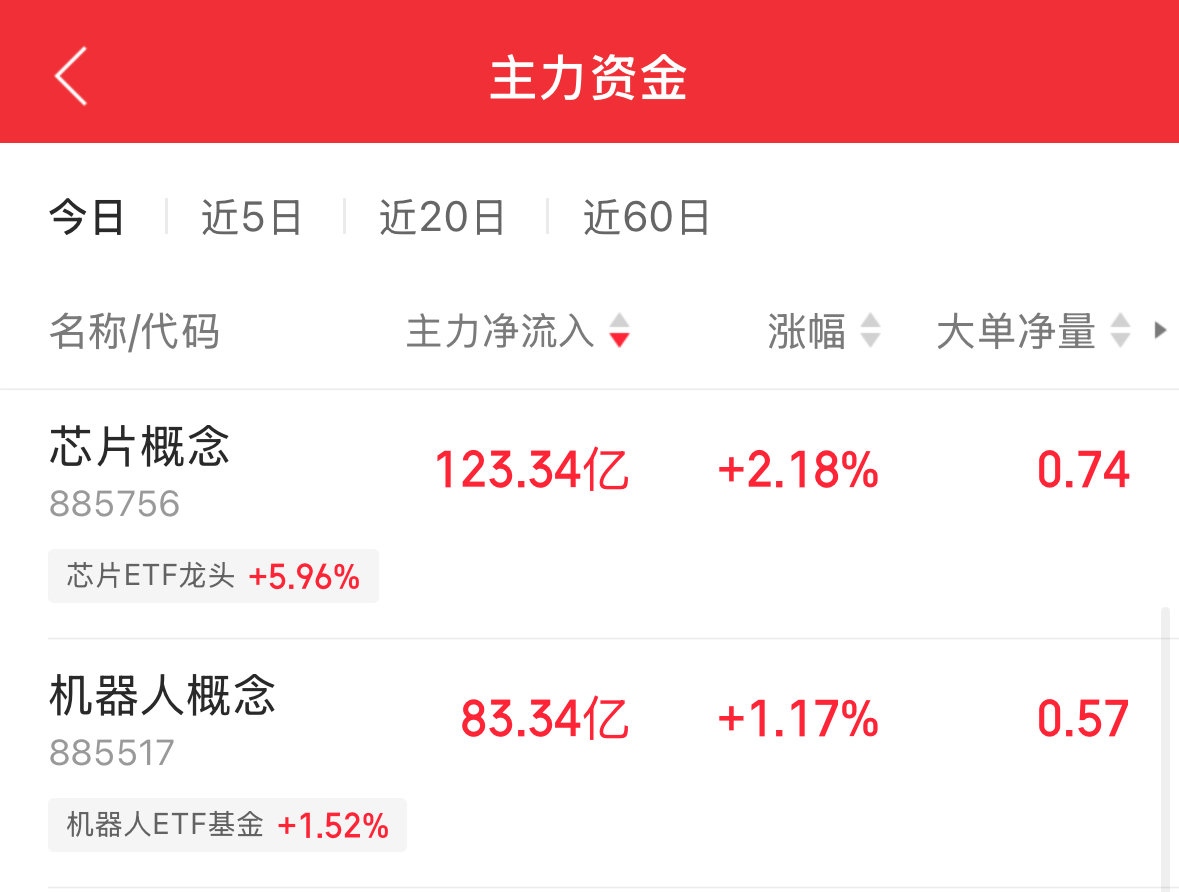 资金面同样火热。芯片板块净流入123.34亿元,断崖式领先机器人概念,后者净流入超80亿元。“后起新秀”可控核聚变板块则净流入45.87亿元。